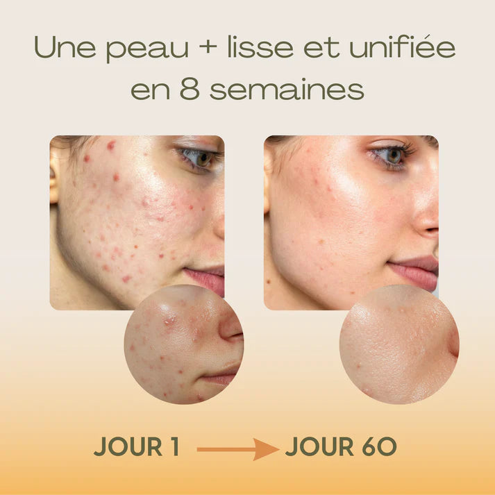 Après environ deux semaines d’utilisation régulière, la peau paraît plus calme, le teint plus uniforme et les imperfections commencent à s’atténuer.