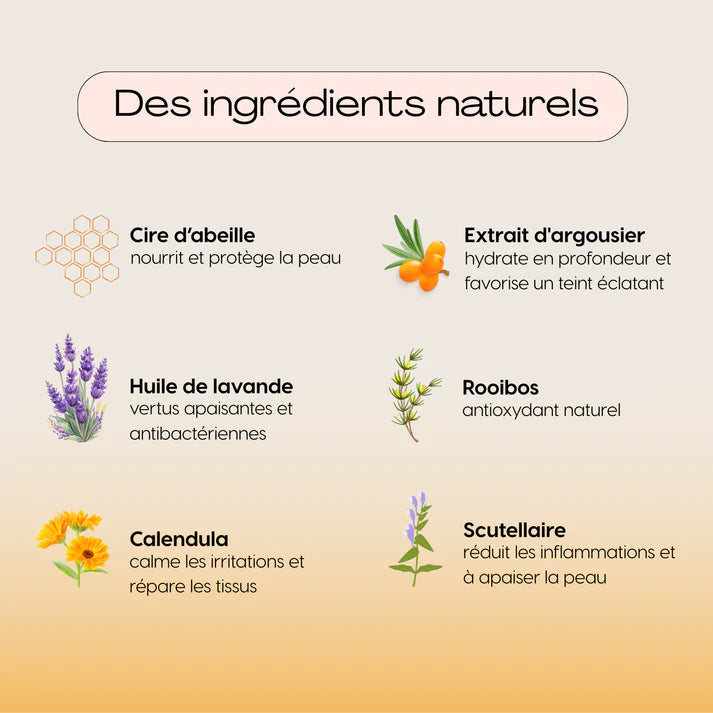 Chaque baume renferme une sélection d’actifs naturels puissants : cire d’abeille, calendula, lavande, argousier, picrorhiza, scutellaire et rooibos. Ensemble, ils nourrissent la peau, apaisent les irritations et contribuent à un teint équilibré et lumineux.