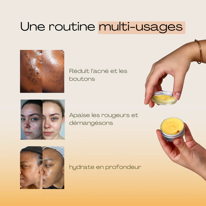 Soin réparateur : les baumes calment les rougeurs, réduisent les imperfections et unifient la peau.