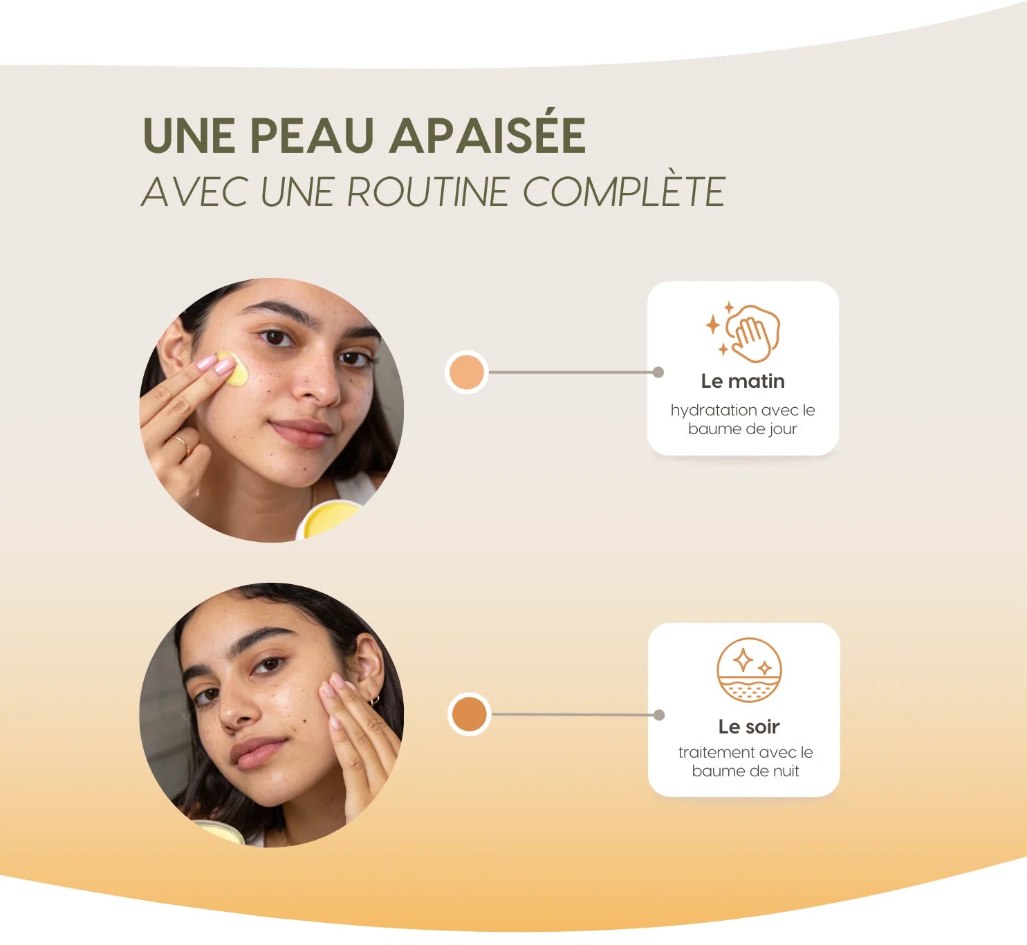 Faciles à utiliser : Appliquez le baume adapté selon le moment de la journée pour nourrir, protéger et apaiser votre peau en douceur.