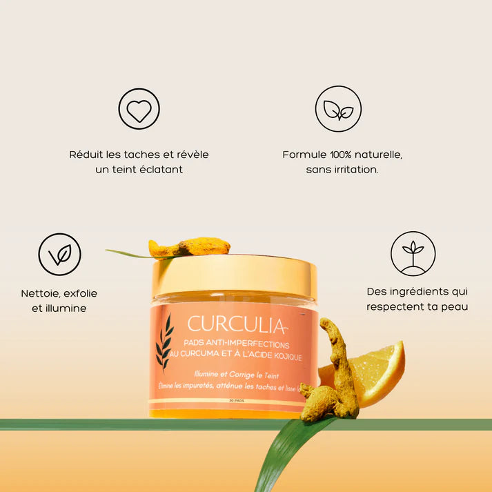 Formulés à base d’ingrédients naturels comme le curcuma et l’acide kojique, les pads et le sérum Curculia Skin offrent une solution douce et efficace pour réduire les taches et uniformiser le teint.